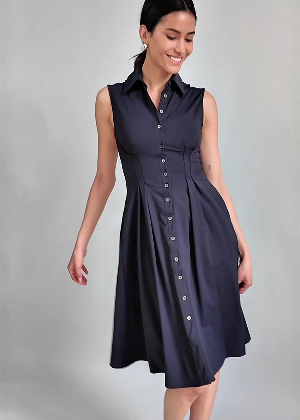 The Sleeveless Fit-and-Flare Shirt Dress is the kind of piece you reach for when you want to feel put together without overthinking it. Designed to flatter with a softly tailored waist and fluid movement through the skirt, it delivers an effortless, finished look that works from day plans to evening plans with ease. The sleeveless cut keeps it light and versatile, while the structure does the work for you—no styling tricks required.